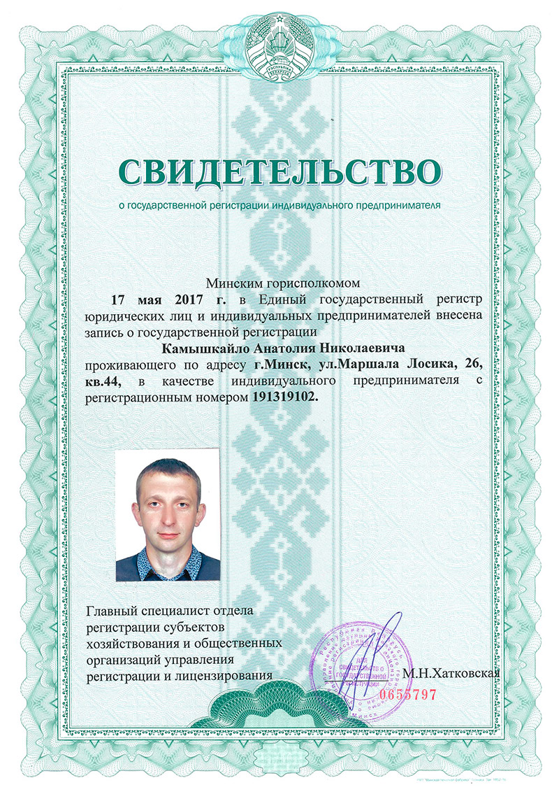 Свидетельство о регистрации #0655797, выдано 17.05.2017г. Минским горисполкомом.